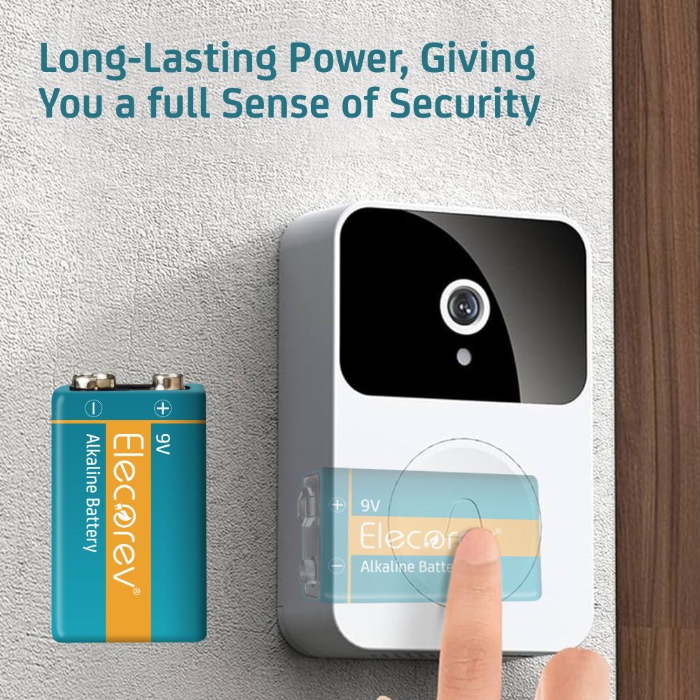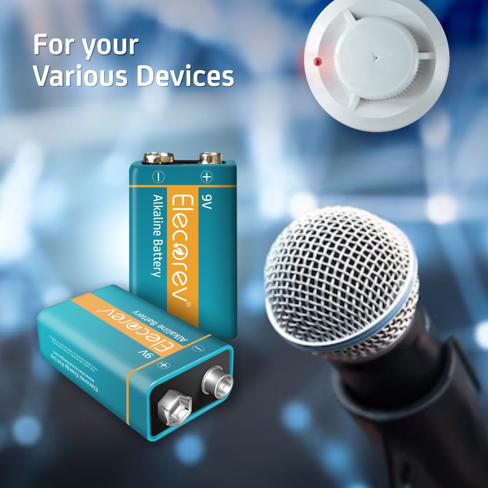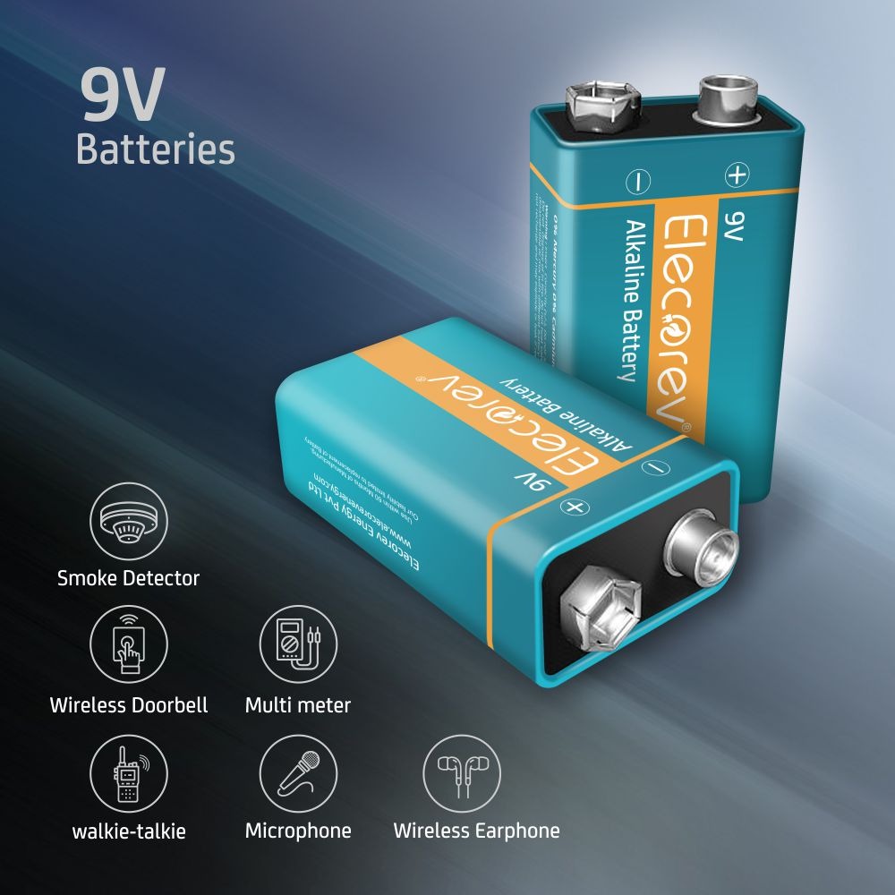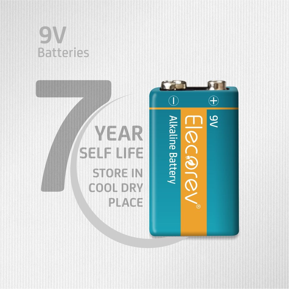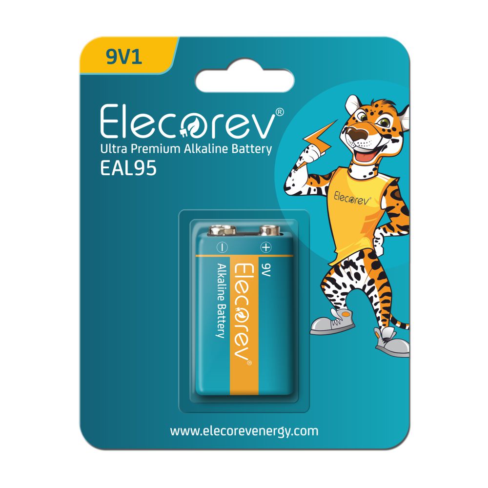 - Elecorev alkaline 9V Rectangular battery with a compact 9-volt design.