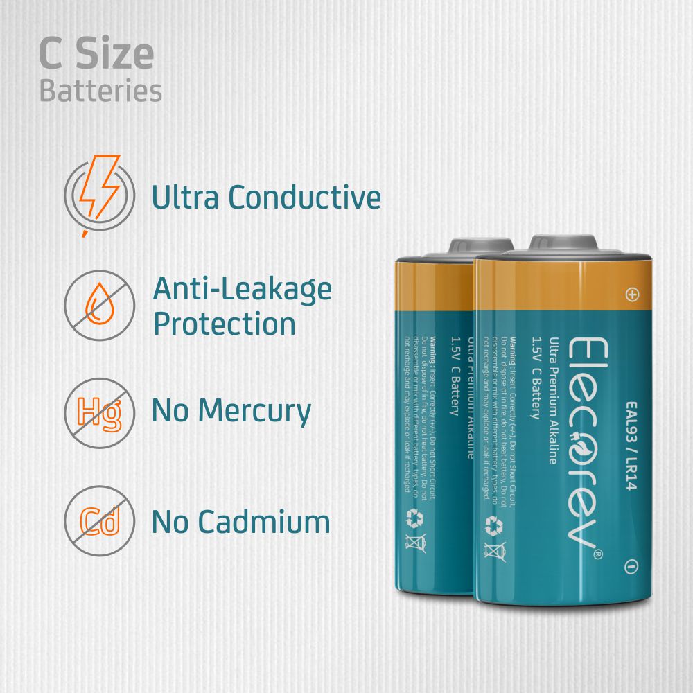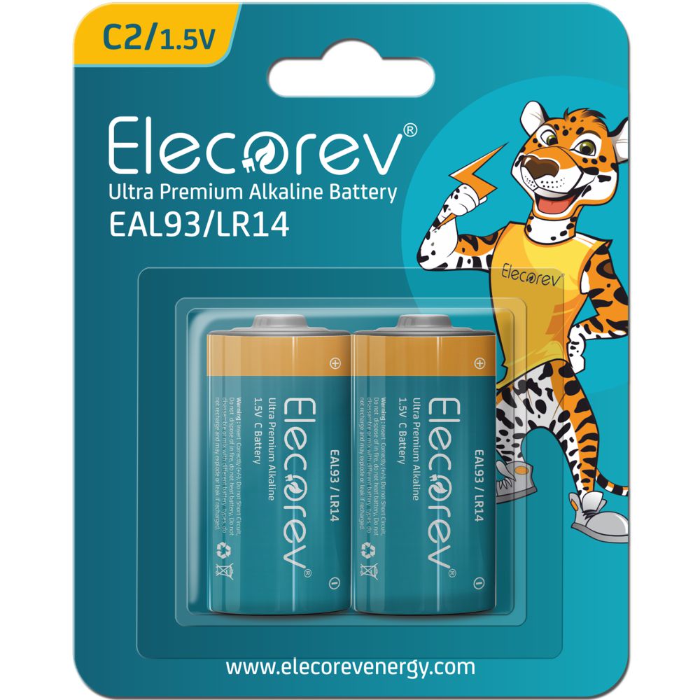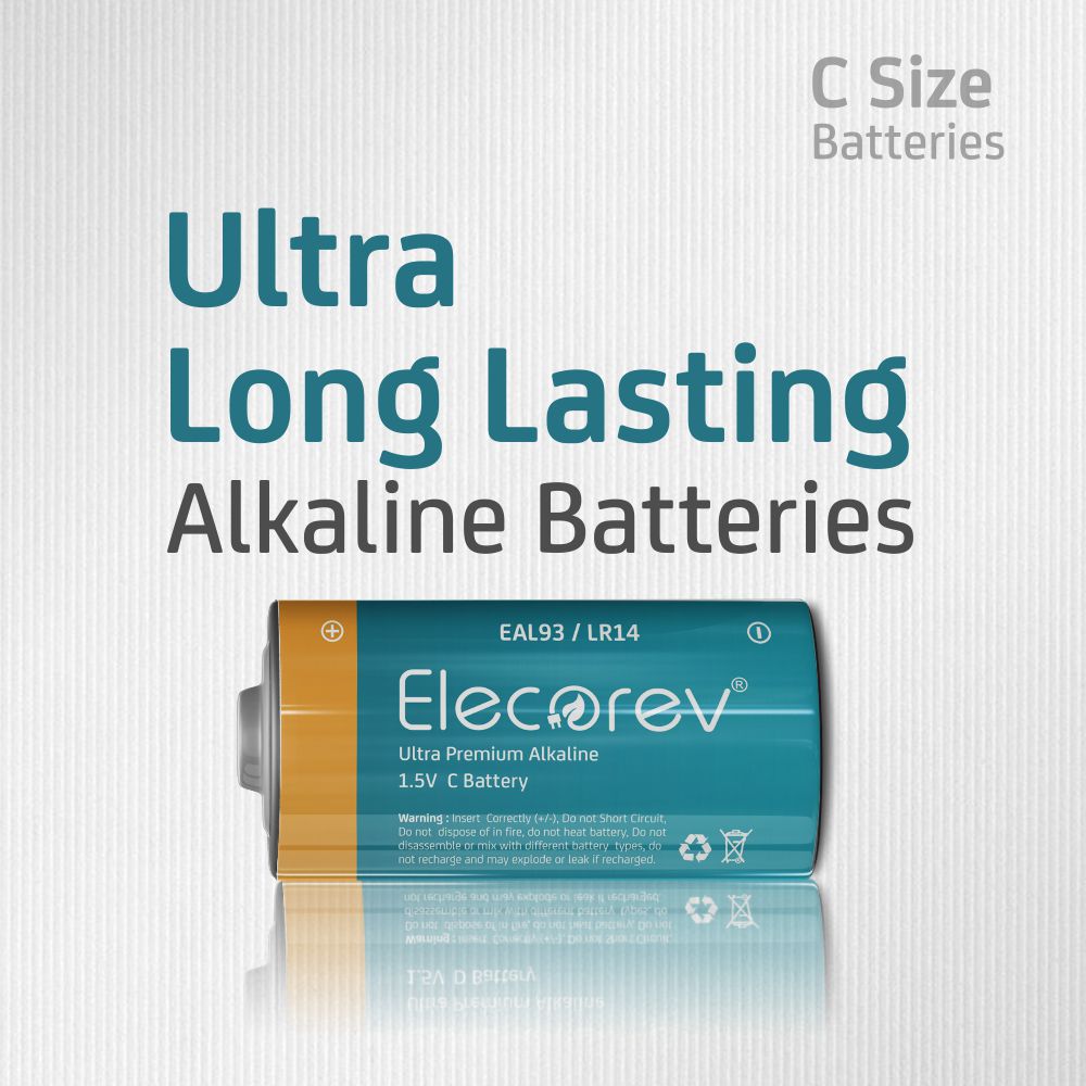 - Elecorev alkaline C size Cylindrical battery with a standard size.