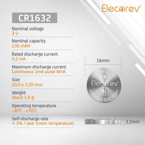 - Elecorev Lithium CR1632 Coin batteries have a low self-discharge rate.
